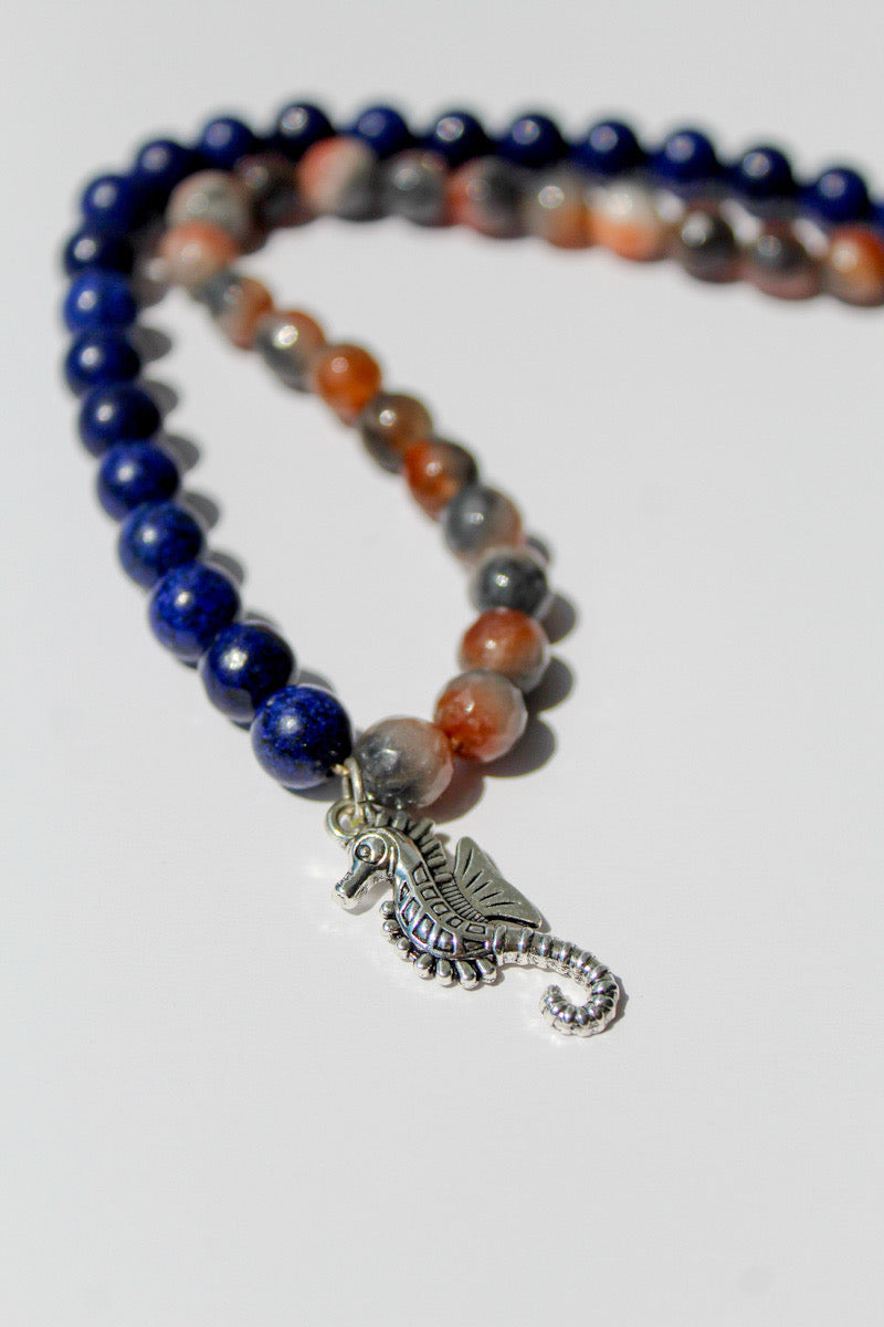 Collar elaborado con piedras naturales, Lapizlasuli y Agata, dije en acero.