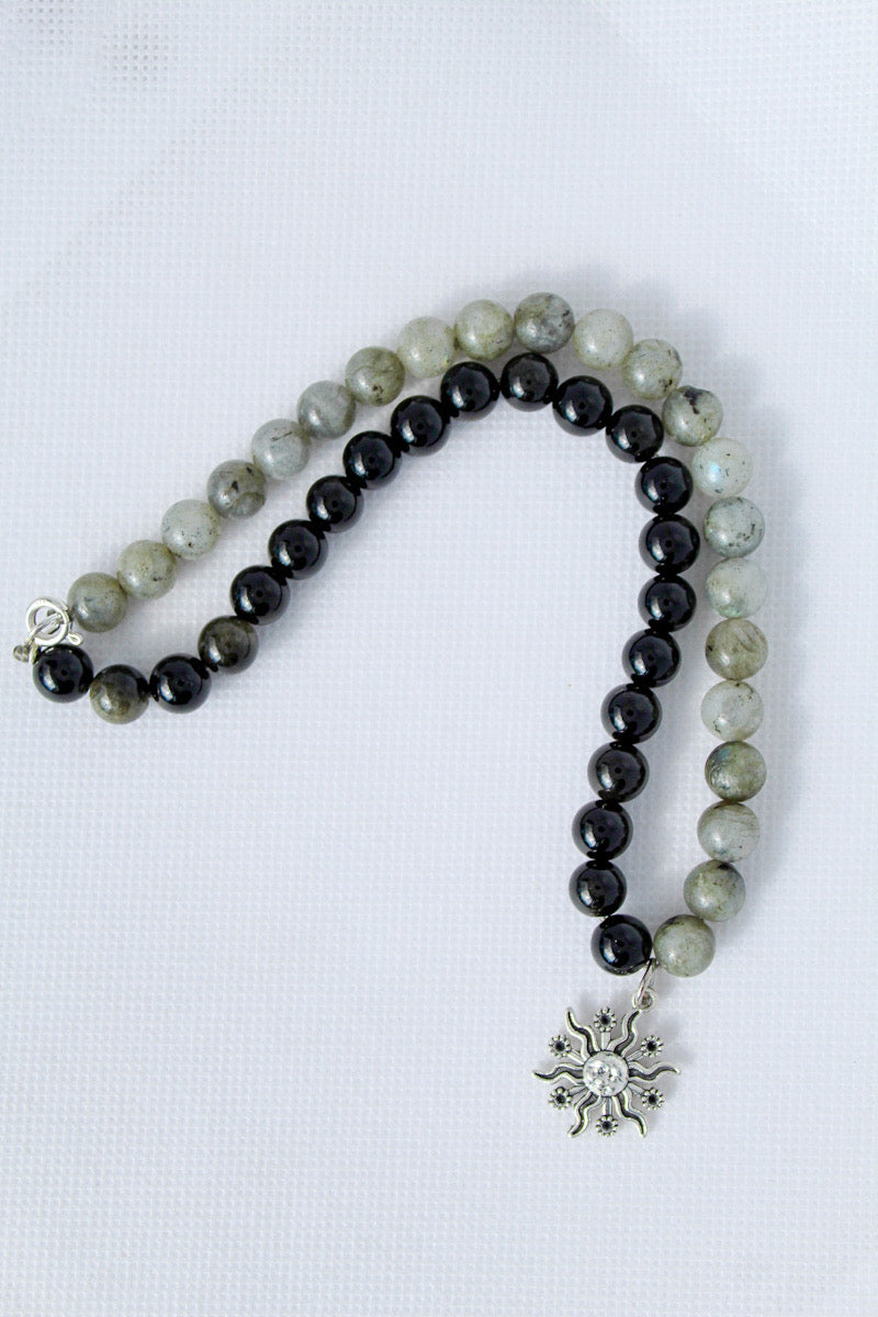 Collar elaborado con piedras naturales, Labradorita y obsidiana, dije en acero.