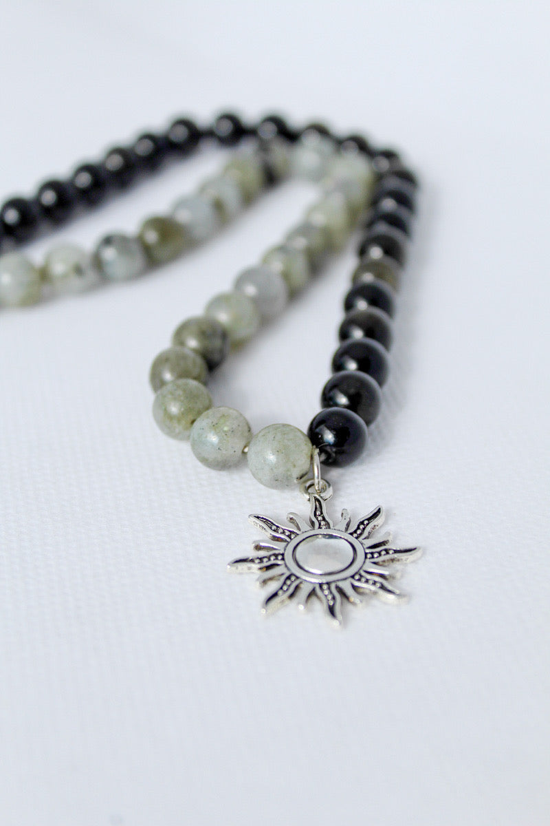 Collares elaborados con piedras naturales Labradorita y Obsidiana con dijes en acero.