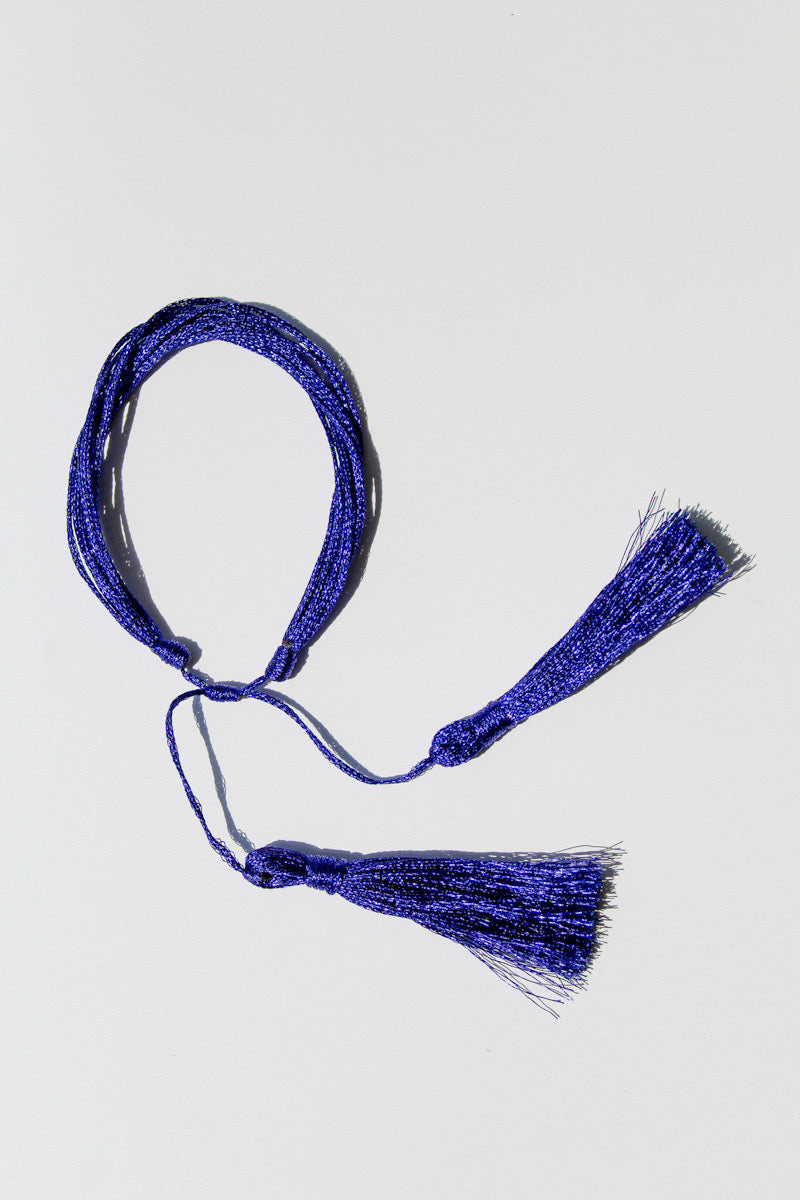 Pulseras elaboradas a mano en hilo metalizado, finalizadas con nudo corredizo y borlas de decoración.
