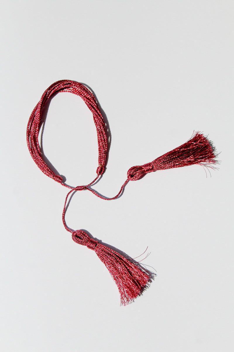 Pulseras elaboradas a mano en hilo metalizado, finalizadas con nudo corredizo y borlas de decoración.