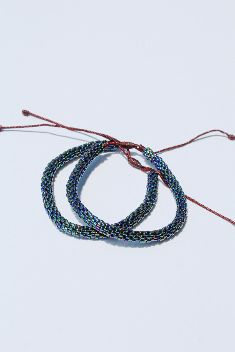 Pulseras tejidas a mano con delicas de Miyuki en forma cilíndrica, con cierre corredizo en hilo.